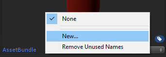 Щоб призначити назву набору ресурсів, виберіть ресурс у вікні «Проект» (це може бути Prefab, Texture або навіть Scene), потім у вікні «Інспектор» у самому низу клацніть спадне меню, а потім натисніть 'New...' (або клацніть назву наявного набору ресурсів).