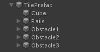 - Створіть 3 GameObjects всередині об’єкта "TilePrefab" і назвіть їх "Obstacle1", "Obstacle2" і "Obstacle3"