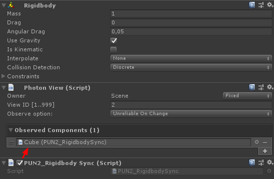 }- Прикріпіть PUN2_RigidbodySync до обох кубів, а також призначте його Photon View "Observed Components":