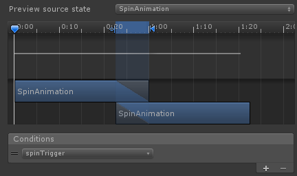 - Клацніть стрілку переходу, а в інспекторі в розділі «Умови» натисніть (+) і переконайтеся, що вибрано параметр spinTrigger
