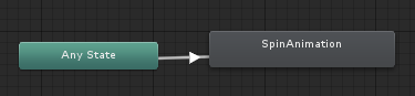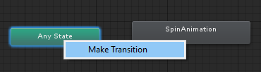 - Нарешті виберіть "Any State" -> Клацніть правою кнопкою миші -> Зробити перехід, а потім наведіть курсор на SpinAnimation: