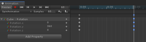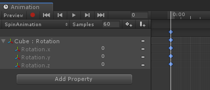 - У вікні анімації натисніть AddProperty -> Transform -> Rotation