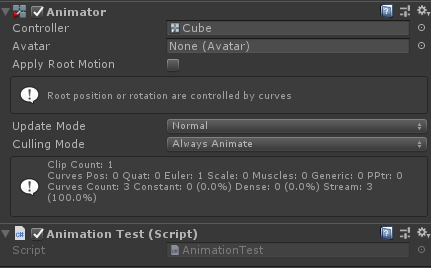 }- Приєднайте сценарій AnimationTest.cs до Cube з компонентом Animator: