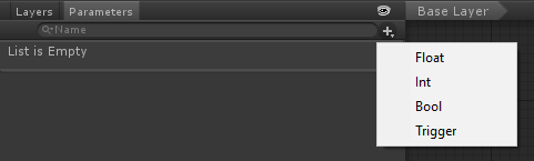 Ви помітите, що є кілька доступних типів, але наразі ми виберемо Trigger, він схожий на bool, але на відміну від bool, він автоматично встановлюється на false після завершення анімації, що корисно для одноразової анімації: