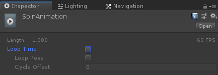 - За замовчуванням для анімацій, створених за допомогою Unity, увімкнено цикл, але оскільки ми хочемо відтворити анімацію лише один раз, нам потрібно вибрати анімаційний кліп у вікні проекту, а потім зняти прапорець у полі «Час циклу»: