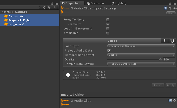 Наприклад, у моєму проекті я маю 3 звуки з різними цілями, і, як бачите, усі вони мають стандартні налаштування імпорту, які не підходять для кожного типу звуку.